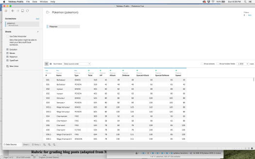 If you haven’t cleaned up your data, now is the time to do that. All set? Now, the fun begins. Click on the Sheet 1 tab at the bottom of the window. This will open up the workspace where you can begin to play with the data, and decide which information from your dataset you want to compare and contrast. This part is mainly trial and error. The more you move things around the clearer it all becomes. I chose a dataset of 633 Pokemon and their stats from the Tableau Public site. After a lot of playing around, cursing, and talking with others who’ve used Tableau in their professional experiences, I began to get a better handle on where to put things, which visualization to use, and how filter the data. First, you must move the column and row information to where you want it for your visualization. Like this: